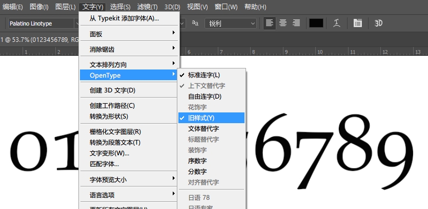 在 PS 中实现旧式数字有些麻烦,首先要勾选上「文字 - OpenType - 旧样式」,再键入数字,这是针对本身带有旧式数字的字型,要是本身不带有旧式数字,也没办法显示出来。还有一种情况就是要是某个字型默认显示的是旧式数字,我暂时还没看到强制使用等高数字的办法。