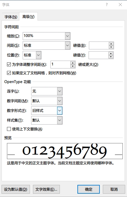 Word 中只要在字体面板高级选项卡中「OpenType 功能」中「数字样式」中选择「旧样式」就好。